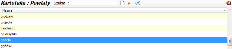 Program dysponuje wykazem Powiatów w Polsce. Słownik jest listą przedstawioną w formie prostej tabeli z jedną kolumną zawierającą nazwy powiatów. Dzięki takiej bazie, przy wpisywaniu adresów można szybko znaleźć, wybrać i przypisać właściwy powiat każdemu pracownikowi (w menu Kartoteki/Kartoteka osobowa/Dane adresowe) lub firmie (w menu Kartoteki/Dane firmy/Dane adresowe).