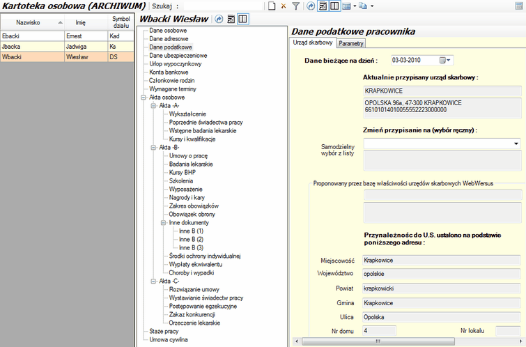 Po zatwierdzeniu zmiany, pracownik zostaje przeniesiony do menu Kartoteki/Archiwum. Jest to miejsce w programie, w którym mamy dostęp do listy wszystkich osób, którym nadaliśmy status archiwalny. Podświetlając dowolnego pracownika w tabeli Archiwum, można przeglądać i edytować jego dane, uporządkowane tematycznie w postaci drzewa, tego samego, które omówiliśmy w dziale Pracownicy.